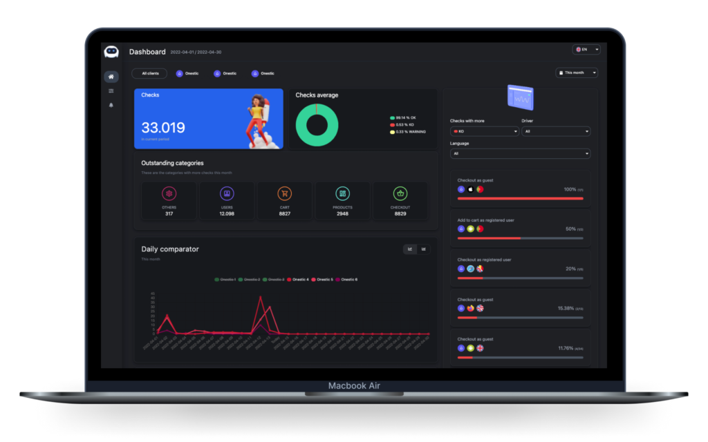 With a complete dashboard you can follow the evolution of the status of your shop. Check for errors and find out which Tests are the most problematic and which work best. Get statistics by language, device or browser and detect time periods to study possible problems.